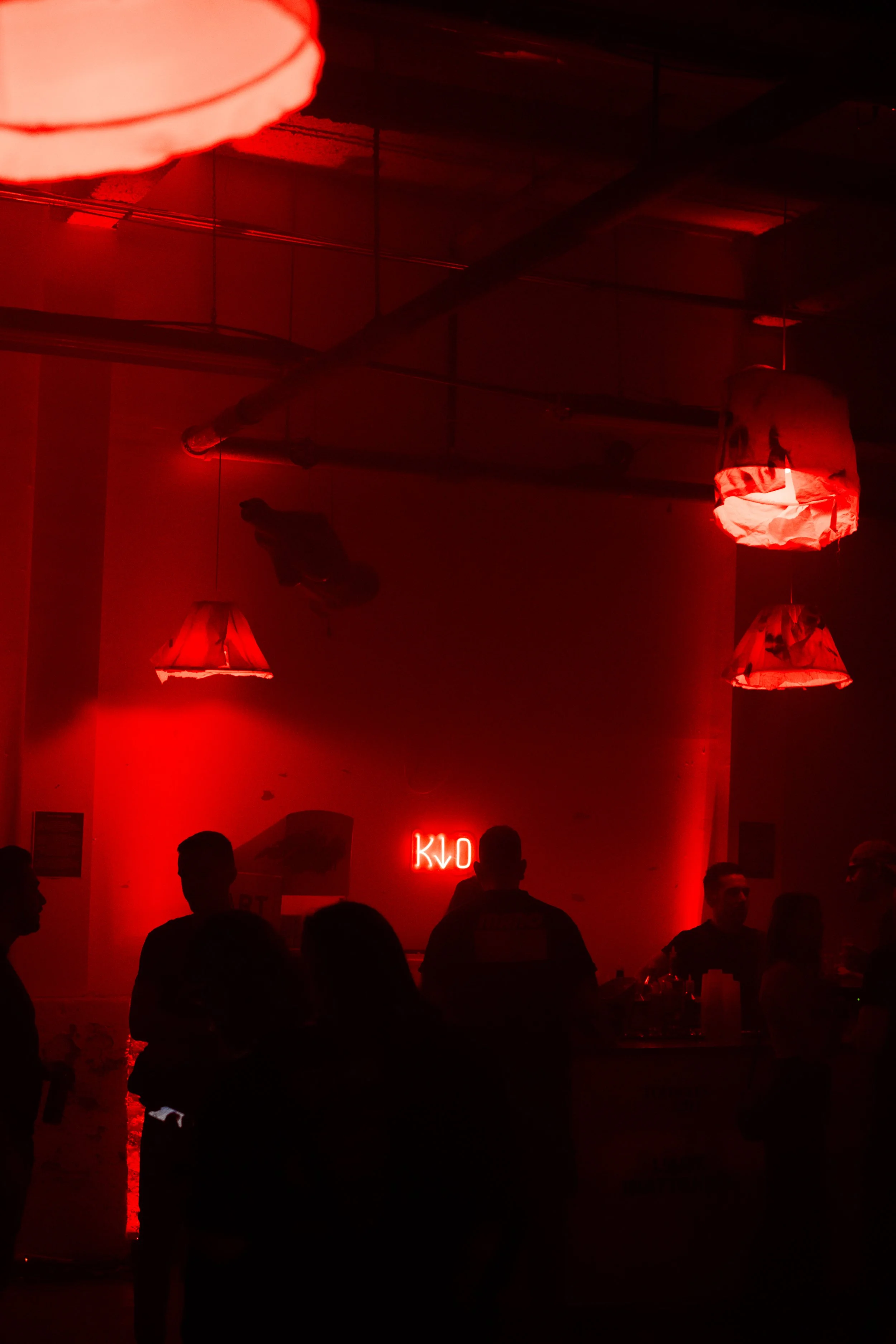 Silhouette of a person with arms crossed, backlit by red and blue lights in a dark room, likely at a nightclub or party.